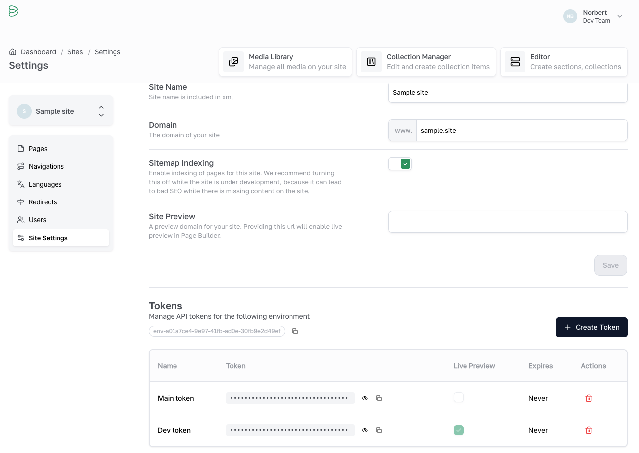 Visiting the Brease CMS you need to go to your site's settings, and generate an API token. You can find your environment ID here as well:
